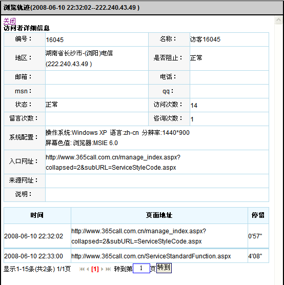 點擊上圖中某一條查詢結(jié)果的“詳細”操作,彈出該訪問者的詳細信息: